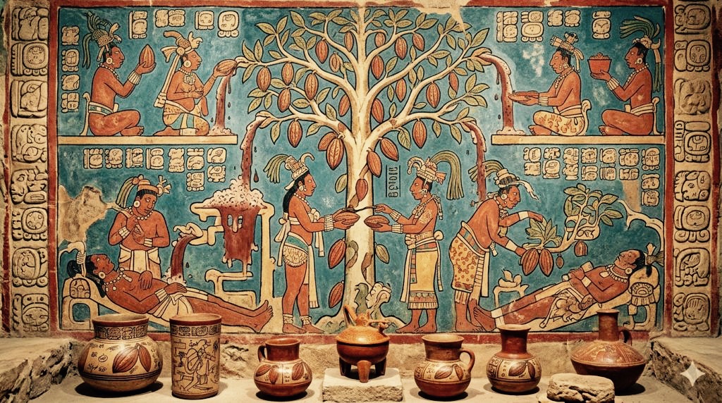 マヤ文明においてカカオは、単なる食物ではなかった。宗教儀式、結婚式、そして葬儀——人生の節目を彩るすべての場面に、カカオは欠かすことのできない「神聖な贈り物」として捧げられた。マヤの壁画や土器にはカカオの実が繰り返し描かれており、その液体は血液の象徴とも見なされていた。