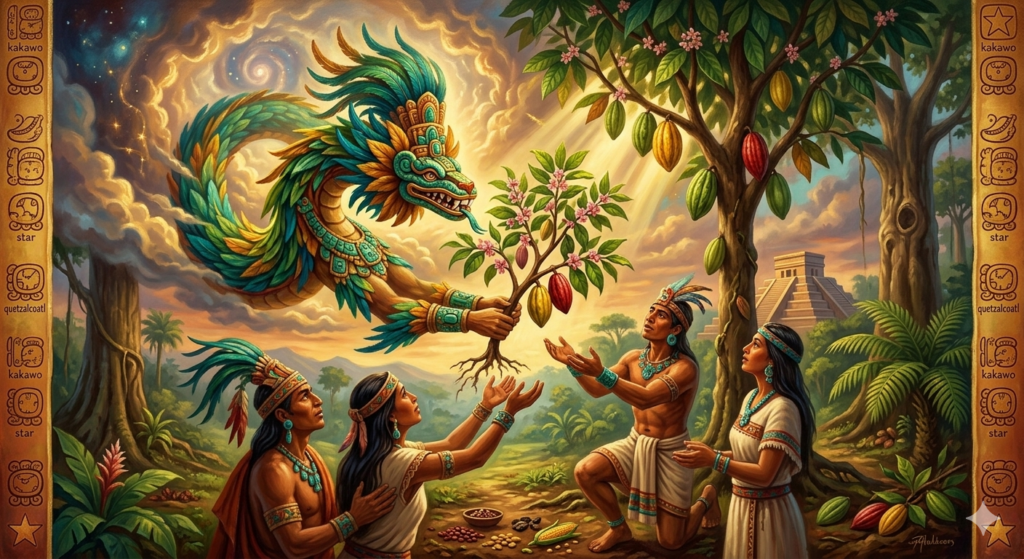 アステカ神話はさらに踏み込む。羽毛を持つ蛇神「ケツァルコアトル」が、天界からカカオの木を地上の人間に与えたという。神が人類に与えた贈り物——だからこそ、カカオは特別だったのだ。