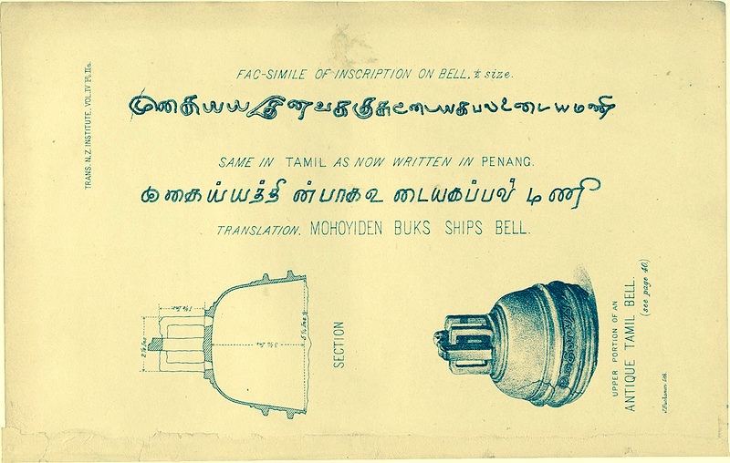 タミル・ベルの実物をもとにした19世紀の記録図。ニュージーランドで発見された謎の青銅製の鐘