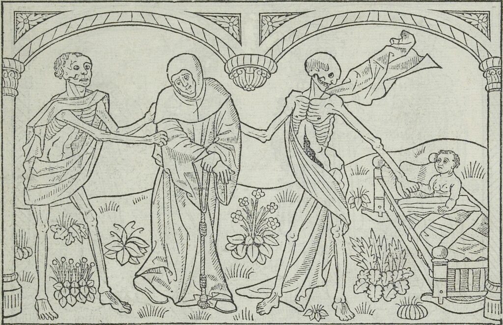 14〜15世紀に広まったこの視覚表現では、骸骨が教皇から農民まであらゆる階層の人間を手を取り、死へと導く様子が描かれる。