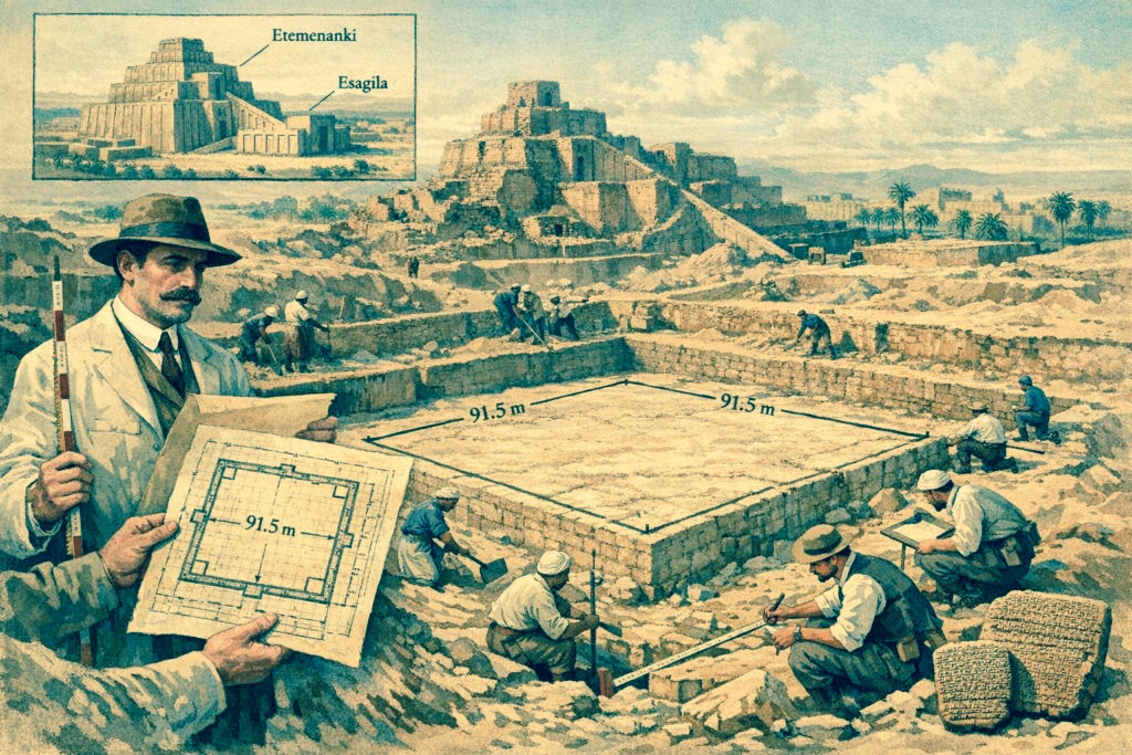 19世紀末、ドイツの考古学者ロベルト・コルデヴァイがバビロン遺跡の発掘を始めた。1899年から1917年にかけて、彼のチームは砂の下からエサギラとエテメンアンキの遺構を掘り出した。発見された基礎の正方形——一辺91.5メートル。エサギラ粘土板に記された寸法と完璧に一致した。