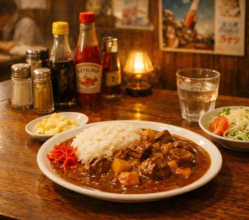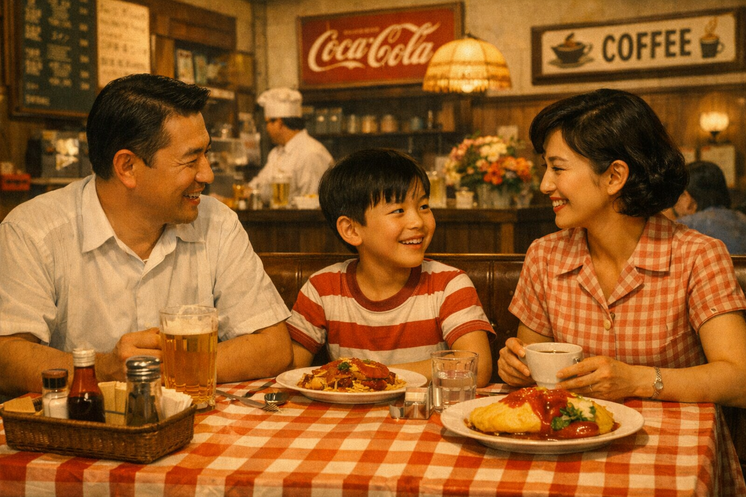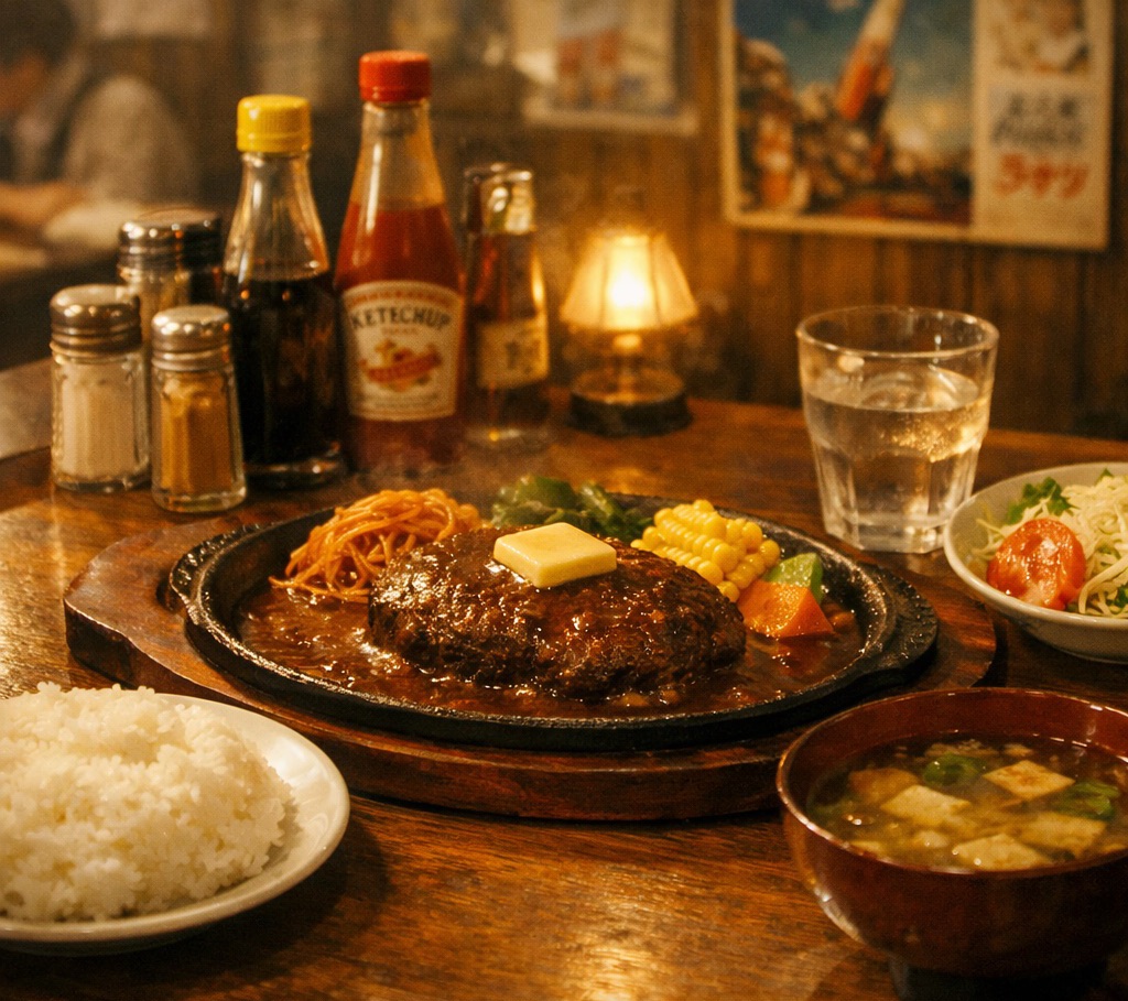 扉を開けた瞬間に広がる、バターと肉の焦げる匂い。ガラスケースに並ぶ色鮮やかな料理のサンプル。ハンバーグ、エビフライ、カレーライス。少しざわついた店内には、旅の途中の家族連れが何組も座っていた。
