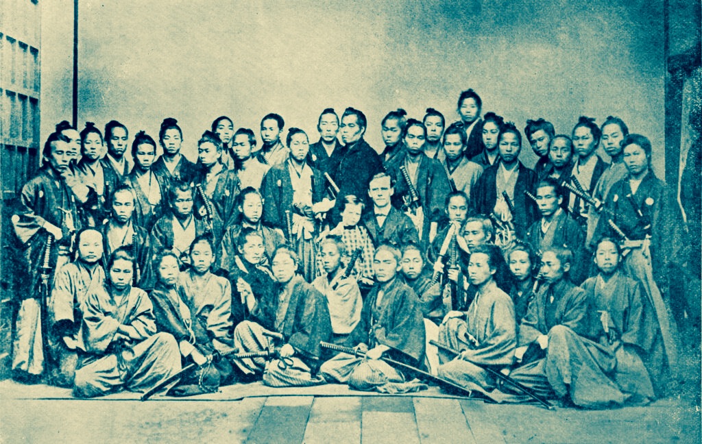 中央にはオランダ人宣教師グイド・フルベッキが座り、その周囲を40名以上の日本人が囲んでいる。