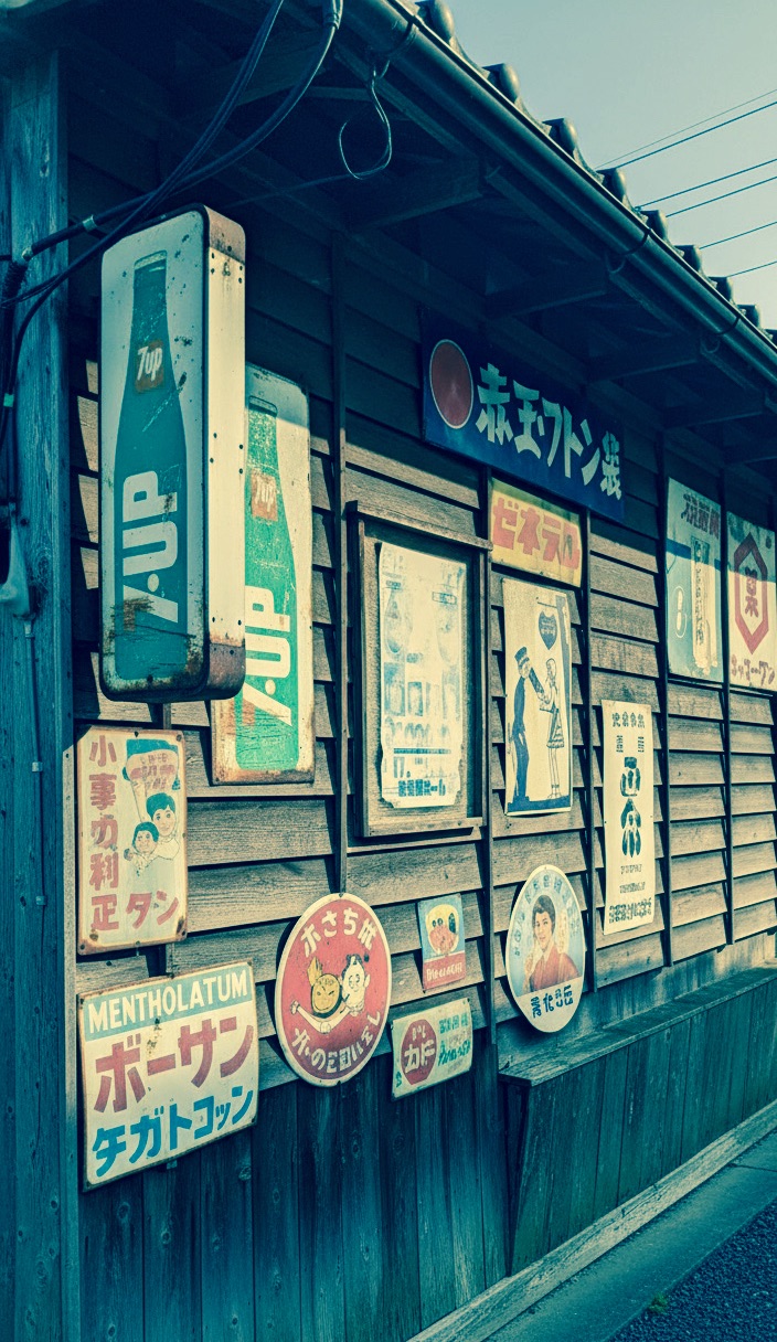 そこにもってカラフルなホーロー看板が貼られる事で殊更に目を惹く広告の意味を成していたのです。