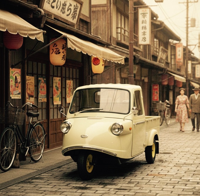 四輪トラックに比べて圧倒的に安価で、狭い路地も軽快に走れる──まさに昭和の商売人たちが求めていた機動力そのものでした。映画『ALWAYS 三丁目の夕日』に登場するミゼットの姿は、あの時代の空気感を鮮やかに蘇らせてくれます。豆腐屋さん、酒屋さん、クリーニング屋さん……街のあちこちで、ミゼットが元気に荷物を運んでいたのです。